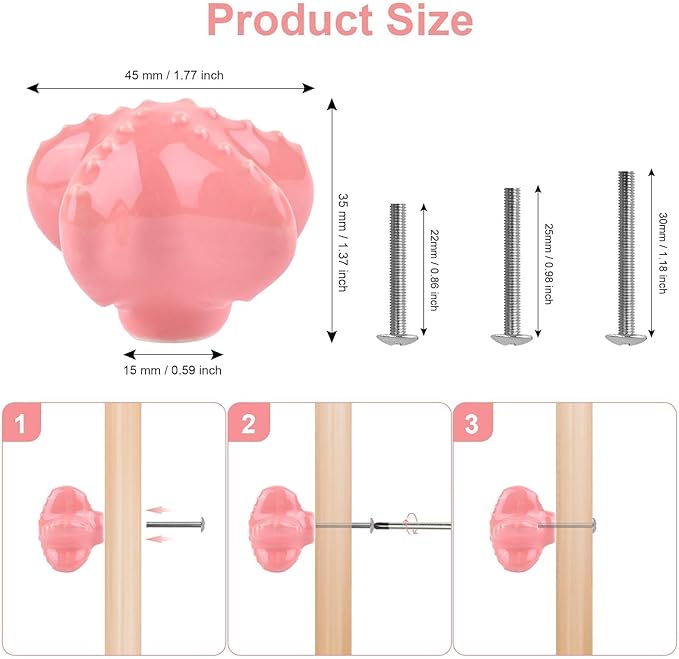 - Size: The total leghth of the ceramic knobs is 45mm/1.77inch; Base diameter is 15mm/0.59inch; Height is 35mm/1.37inch. Color: Pink, Blue, Green, Yellow.