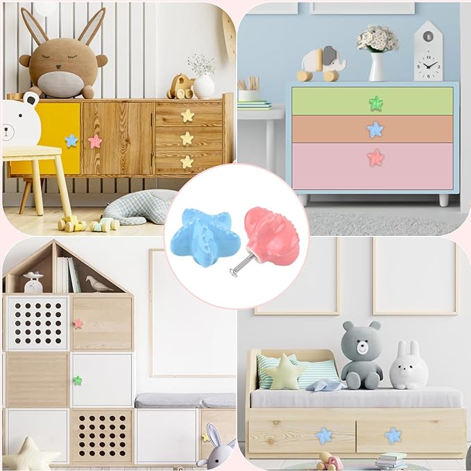 4X Colorful Cute Glossy Ceramic Knobs Starfish-Shape Lovely Door Pull Knob Cabinet Closet Ceramic Drawer Cupboard Kitchen Dresser Kids Child Bedroom Pulls Wardrobe Handles