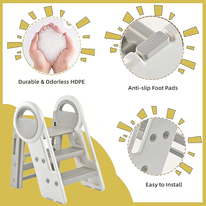 Nisorpa Foldable 3 Step Stool, Adjustable Step Stool, Toddler Helper Stool with Handles, Non-Slip Toilet Potty Training Stool, Plastic Ladder for Bathroom Sink Kitchen (3 & 2 Step Adjustment)