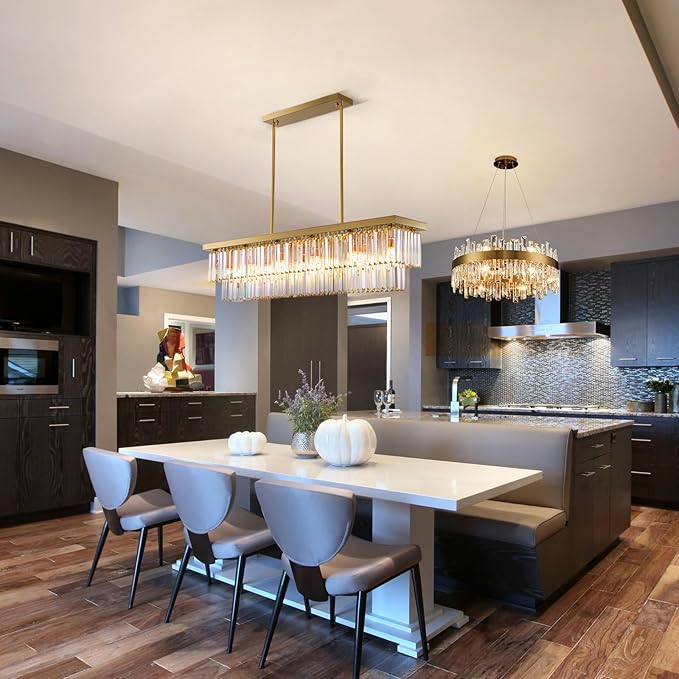 - ✨【Modern Gold Rectangular Chandelier】: Luxury gold chandelier in raindrop design, creating a stunning visual effect and adding an elegant touch in your space. Suitable for living room, dining room, kitchen island, hallway, entryway, foyer, hotel, etc. Materials: Stainless steel and K9 crystals.