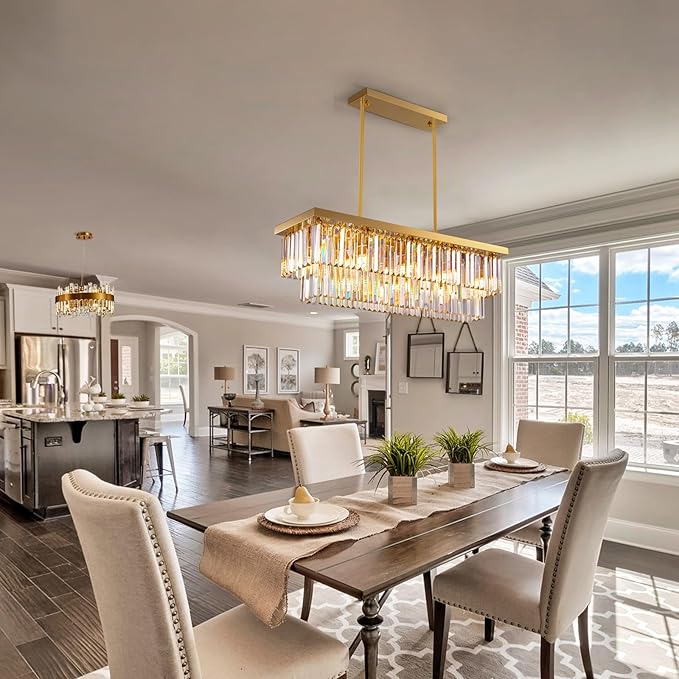 - ✨【Modern Gold Rectangular Chandelier】: Luxury gold chandelier designed with 2 tiers of clear K9 crystals adds a touch of elegance and luxurious to your space, creating a warm & welcoming atmosphere, making it more sophisticated and opulent. Suitable for dining room, living room, kitchen island, office, hallway, foyer, bathroom, etc.