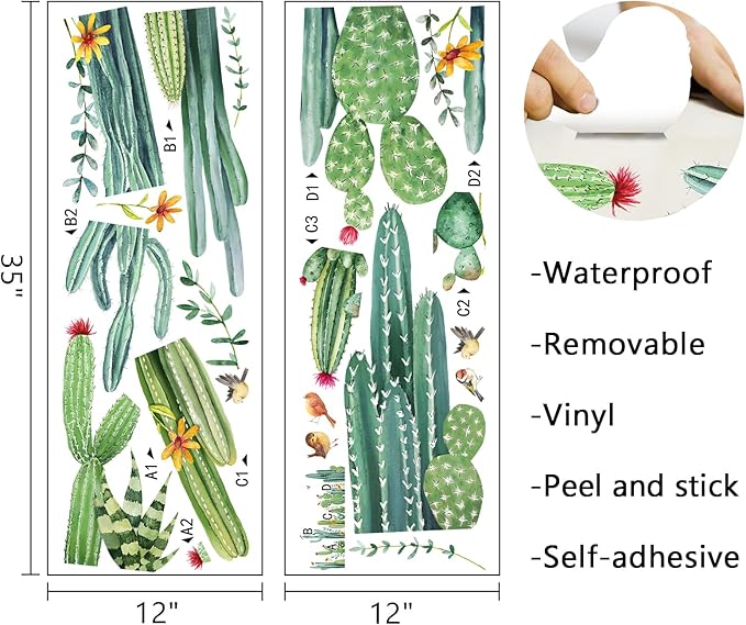 - Package Including: You will get 2 sheets of delicate cactus wall decals and murals in the package. The height of each removable vinyl wall decal is about 35 inches and the width is about 12 inches. Each pattern element can be arranged freely, which allows you use imagination and preference to create your own unique wall decor style. The bright colors and various patterns will greatly add a sweet atmosphere to your home, bedroom, living room, kitchen, bathroom and office