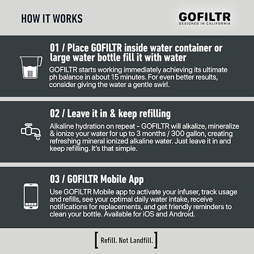 - GOFILTR MOBILE APP - Use the GOFILTR Mobile App to activate your infuser, track usage and refills, see your optimal daily water intake, receive replacement notifications, and get friendly reminders to clean your bottle.