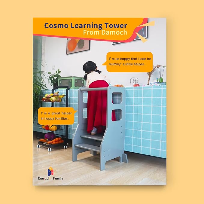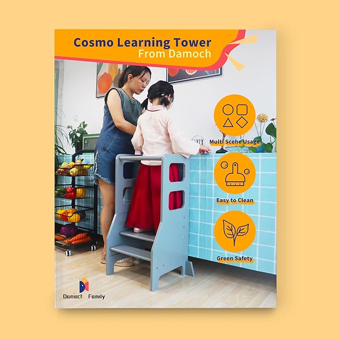 - SIMPLE AND STABLE STRUCTURE✅: The structure of the patented kitchen step stool is very simple and elegant. The standing tower is space-saving. The supports at the bottom make the kitchen stool sturdier. Children can stand on the cooking stool steadily to cook with parents. The two step boards can be adjusted along with toddlers’ growth.