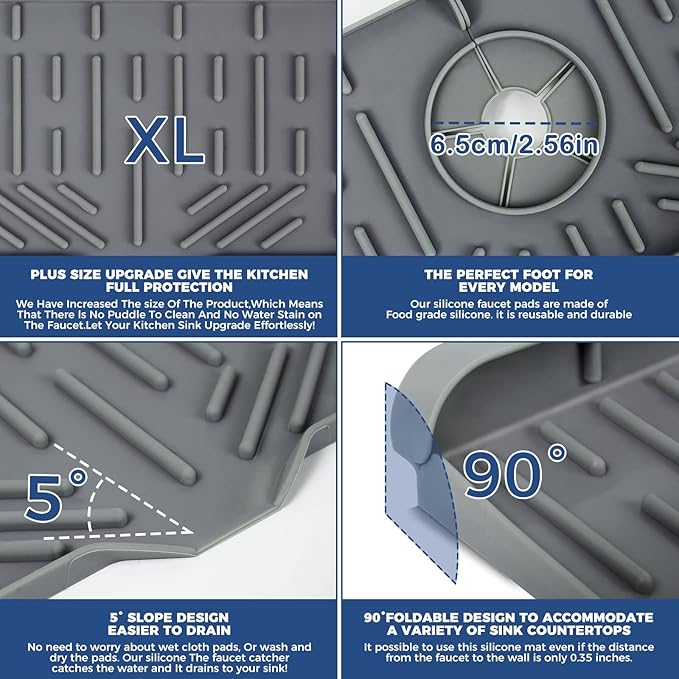 • 💪【5° UPGRADE VERSION】 Silicone faucet mat with upgraded 5° slope design, the kitchen faucet splash guard allows captured water to flow into the sink faster, resulting in faster drying of the kitchen sink. This means never gets soggy, or not having any water spots by the sink faucet. You don't need to worry about the water staying on the sink & bathroom counter. Upgrading your kitchen sink & bathroom countertop in an effort-saving way!
