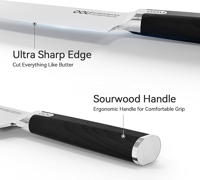• 【HIGH TECH IN KITCHEN KNIVES】Patented BO Oxidation Surface suits an fantastic oxide layer on OOU knife for true anti-rusting. Ergonomic knife handle is made of black colored wood for comfort and durability. It features textured finger points that provide slip resistance and a better grip. The solid handle can minimize wrist tension while providing a secure, comfortable grip no matter the size of your hand or where you are gripping the handle.