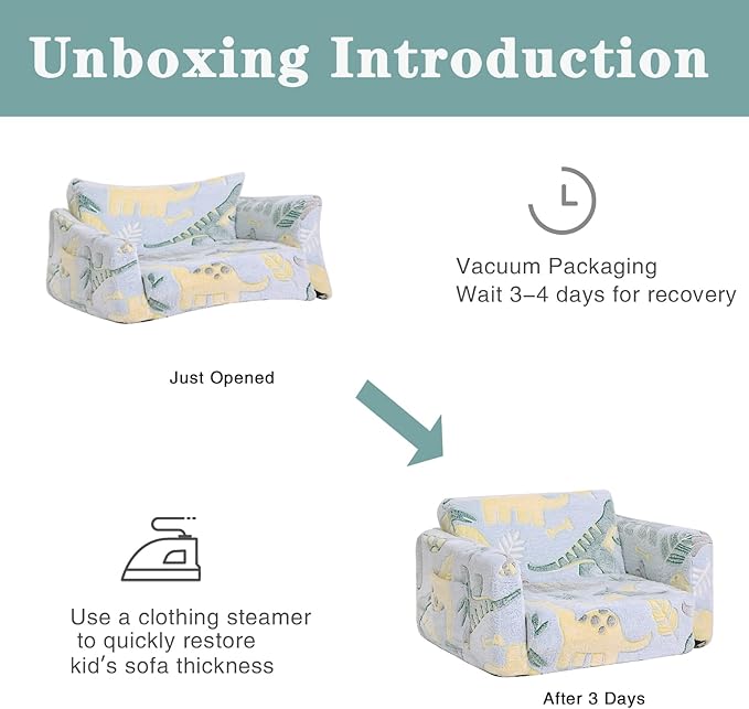 - Tips: When you receive the children's sofa, it may have wrinkles due to being compressed for shipping, but you can either wait 3-4 days for it to regain its original shape naturally or use a clothing steamer to quickly restore its thickness and remove creases.
