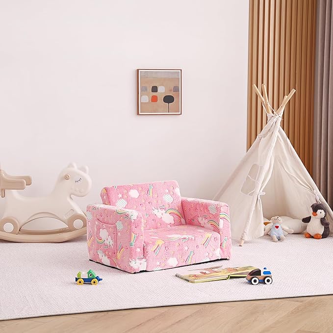 Tiita Toddler Chairs, 2-in-1 Kids Sofa Bed Fold Out, Plush Children's Foam Chair for Boys and Girls, Small Convertible Couch for Baby, Pink Rainbow