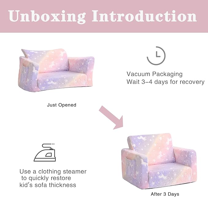- Tips: When you receive the children's sofa, it may have wrinkles due to being compressed for shipping, but you can either wait 3-4 days for it to regain its original shape naturally or use a clothing steamer to quickly restore its thickness and remove creases.
