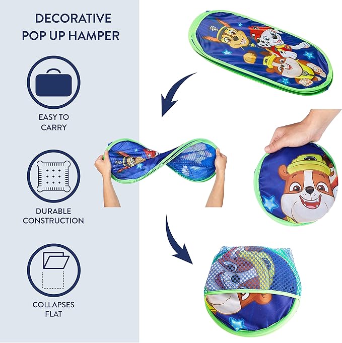 - GREAT GIFT: A useful and great gift for someone dear to you. For all the Paw Patrol fans, this hamper will put a smile on your loved one’s face, making them look forward to each day that comes. Laundry or putting away toys doesn't have to be a chore, make it easy with this spacious pop up hamper. Also, the perfect gift for home décor.