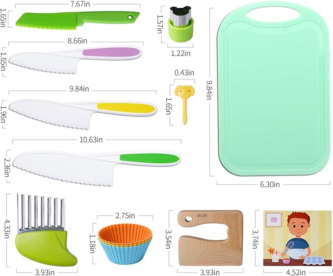 - VERSATILE KITCHEN TOOLS FOR KIDS - These toddler cutting board and knife set are perfect for introducing children to the kitchen. When you cook with your kids, you’re teaching them — not just about food, but basic math, fine motor skills, multitasking, and time management. Plus, if you have a picky eater, getting them involved in the process can help get them excited about new foods. Let them get creative, have fun and develop healthy eating habits from a young age!