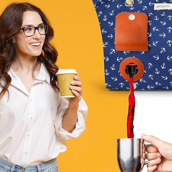 - Built-In Beverage Compartment and Spigot: Cork and Vine’s CVN2005 Navy Anchors print beach tote bag holds 1.5 liters of your favorite drink within an insulated beverage bladder. Built-in fashion flap with snap, covers and protects dispenser spout until you are ready to enjoy.