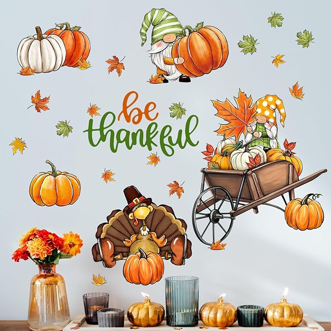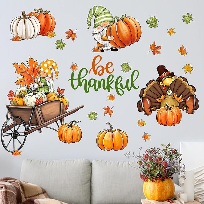 - Thanksgiving Decorations: Our grateful wall decals are designed with various vivid patterns like cute gnomes, gobble turkey, maple leaves, colorful pumpkins and cart. These wall decals and stickers are suitable for bedroom, living room, kitchen, bathroom, patio, farmhouse, retail store, restaurant, coffee house and Thanksgiving party supplies. Perfectly DIY a magic space for your home and office in fall and autumn season