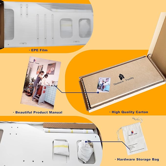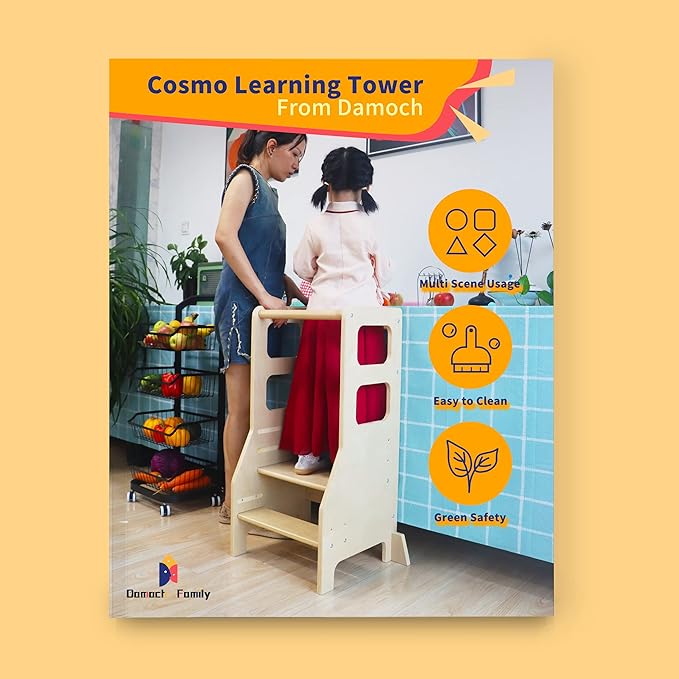 - SIMPLE AND STABLE STRUCTURE✅: The structure of the patented kitchen step stool is very simple and elegant. The standing tower is space-saving. The supports at the bottom make the kitchen stool sturdier. Children can stand on the cooking stool steadily to cook with parents. The two step boards can be adjusted along with toddlers’ growth.