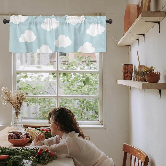 Vandarllin Kids Kitchen Curtains Valances for Windows Blue White Cloud Cartoon Rod Pocket Window Treatment for Kitchen/Living Room/Bedroom/Bathroom,60" X 18" -1 Panel,