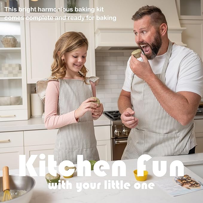 - 🎂 Adorable Matching Apron: Elevate the baking experience with a super elegant matching pinstripe apron. Featuring charming ruffles, a delightful design, and a comfy cotton feel, this apron ensures your little one is not just cooking but doing so in style. The neutral gray stripes design adds a touch of sophistication to this perfect kids' apron.
