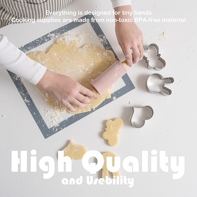 - 🎂 Quality Materials, Lasting Memories: Experience a kitchen set for kids meticulously crafted with quality and care. Featuring food-grade silicone, real wooden accessory handles, stainless steel, and high-quality cotton canvas, this baking set is built to withstand years of baking adventures. Moreover, it is BPA-free and non-toxic, ensuring the utmost safety for your budding chef.