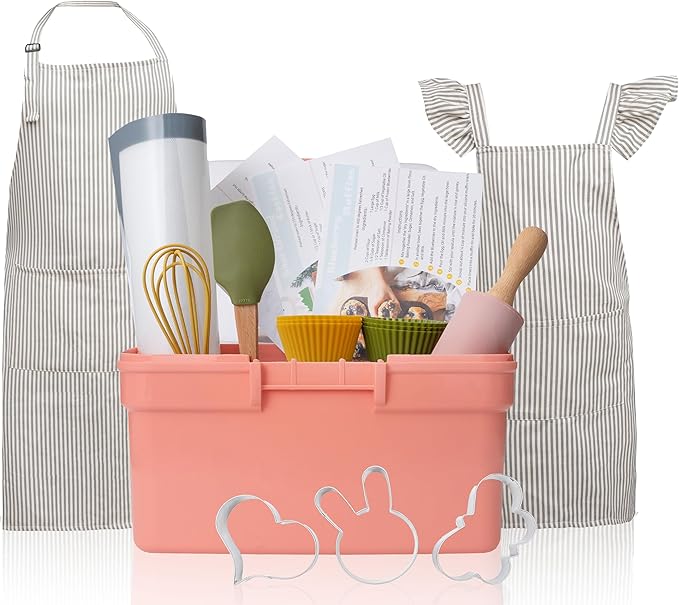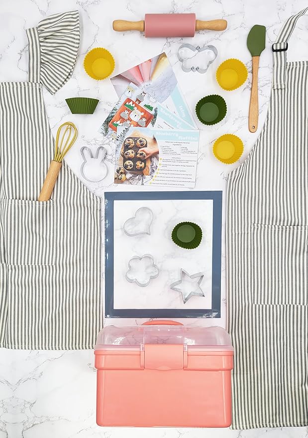 Kids Baking Set with Elegant Matching Apron for Child and Adult, Storage case, Real Working Utensils, Cookie Cutters, and Baking Supplies