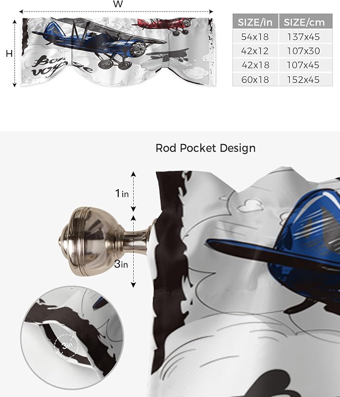 Tie Up Valance for Kitchen Living Room Farmhouse - Biplane Bon Voyage Rod Pocket Adjustable Tie-up Shade Valance for Small Window, Window Valance Balloon Drape for Bathroom 60x18 inches