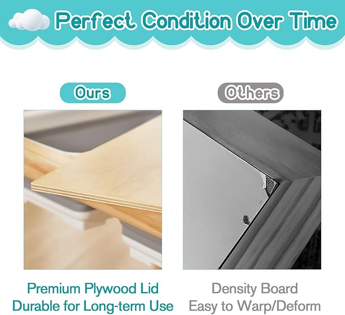 - 【Plywood Board VS. Density Board, Say Bye to Warping and Deformation】Are you concerned about your sensory table top warping or deforming over time? Worry no more! Compared with ordinary density boards, FUNLIO kids sensory table cover is crafted from high-quality plywood, ensuring it remains sturdy and resistant to warping. This means your sensory table will stay in perfect condition to accompany them through countless hours of play.
