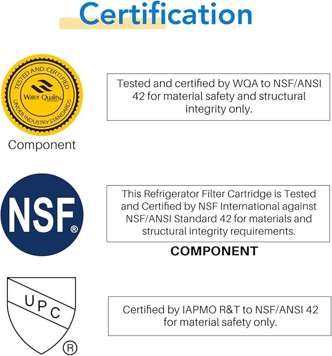 - Authoritative Certifications - Tested and certified by WQA, NSF&IAMPO against NSF/ANSI 42 to reduce 99.06% Chlorine. Reduce sand, sediments, particles, rust, color. Significantly improve the drinking water taste. The filter meets European EC1935-2004 Regulations, and the Australian Water Mark, and has the certifications of TUV, ROHS, REACH, and BPA FREE.