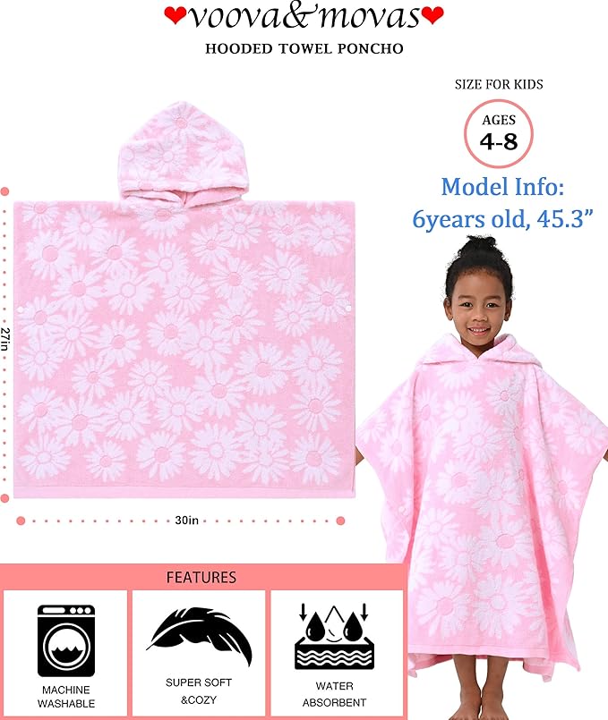 VOOVA & MOVAS Thick Hooded Bath Towel Poncho for Kids (4-8Years) - Soft, Absorbent Turkish Cotton Swim Towel Robe, Perfect for Bathroom | Pool | Swim, Jacquard, Pink with White Daisy Theme