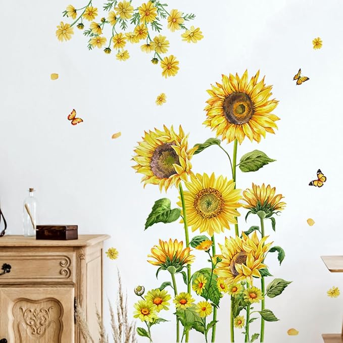 - Elements include sunflowers, butterflies and daisies. Easily fill your room with sunshine. Sunflower height is approximately 70 cm (28 inches) tall.