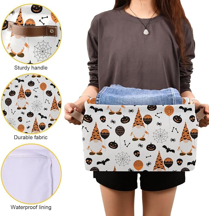 Happy Halloween Gnomes Storage Basket Fabric Kitchen Baskets Spooky Pumpkin Ghost Bat Spider Web Open Home Storage Bins Boxes Foldable Foldable for Candy Toy Decorations Baskets 16×12×8 Inches