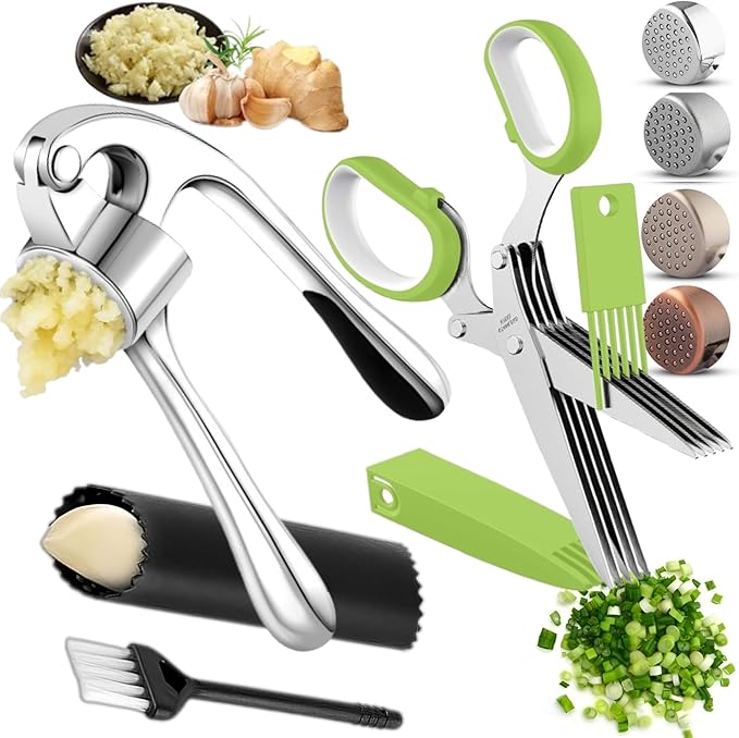 - ✅ WORRY-FREE GUARANTEE: We stand by the quality of our products, offering a hassle-free, LIFETIME WARRANTY. Make cooking a joy with our garlic press stainless steel and 5 Blade Herb Scissors for Kitchen set!