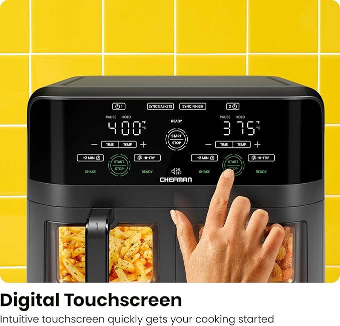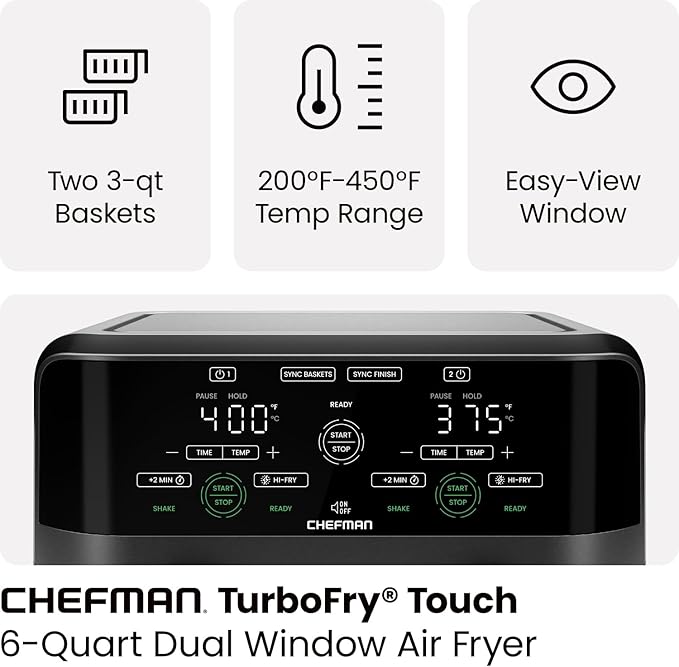 CHEFMAN 6 Quart Dual Basket Air Fryer Oven with Easy View Windows, Sync Finish, Hi-Fry, Auto Shutoff, 2 Independent 3Qt Nonstick Dishwasher Safe Frying Baskets, Digital Double Air Fryer - Black
