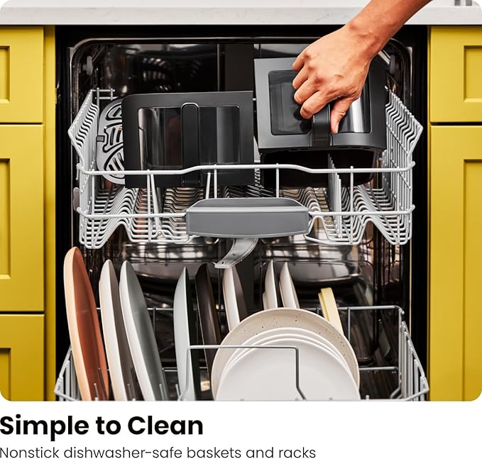 - EASY CLEANUP: The removable, non-stick coated air fryer dual baskets are dishwasher safe and easy to clean after every use.
