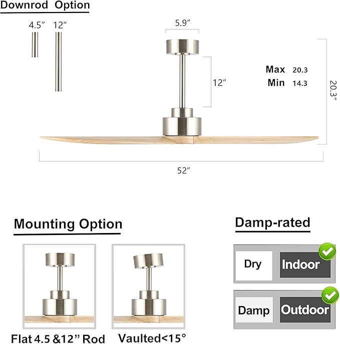 - ✔Easy to Install: The 64-inch blade span makes this ceiling fan perfect for spaces like living rooms, bedrooms or spacy bathrooms (suitable for damp places), adaptible for ceilings tilting within 15°. 3 Down rods (4.5"/12"/24" long) are included to match different ceiling heights.