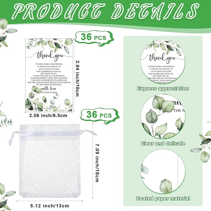 - Bulk Wedding Souvenirs for Guests: this set provides 36 wine corks, 36 bottle openers, 36 thank you cards, and 36 organza bags; This generous quantity and ideal mix are well suited for your daily usage and party gifting requirements