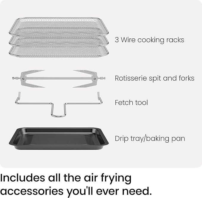 - ACCESSORIES INCLUDED: Includes three cooking racks, stainless-steel rotisserie oven spit and forks, a rotisserie retrieval tool, and a drip tray.