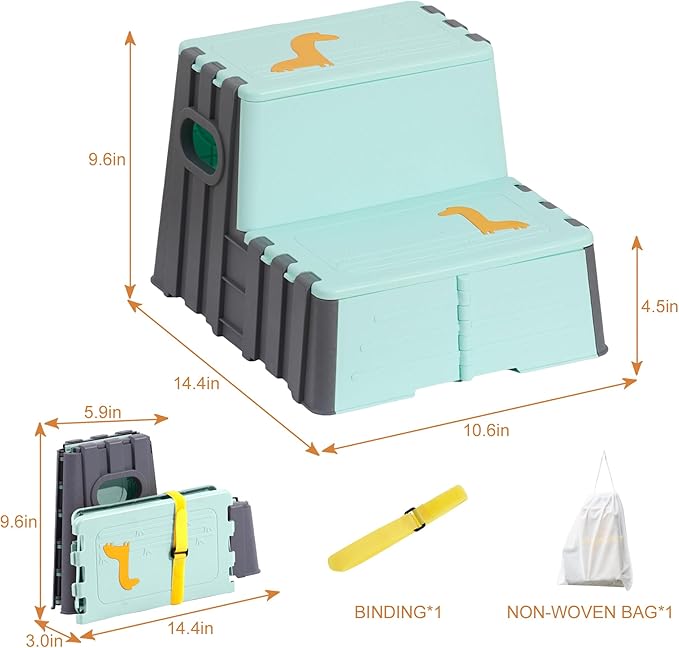 - 【Foldable Design】This foldable toddler step stool is light and easy to carry with folded size:14.4*3.0*9.6in, does not take up space when you take the step stool out for gardening, camping, boating or under the sofa or bed lying down or vertically between a wall and appliance or furniture when not in use.