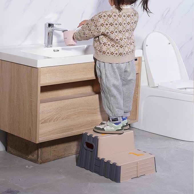 - 【Step Stool for Kids & Adult】The first step of the step tool is 4.5 inches high and the second step is 9.6 inches high, which is in line with the kid's body and makes it easier for your kid to get up and down. With the high quality material and scientific structural design, The stepping stool has a maximum weight capacity of 200 lbs, making it suitable for both children and adults.