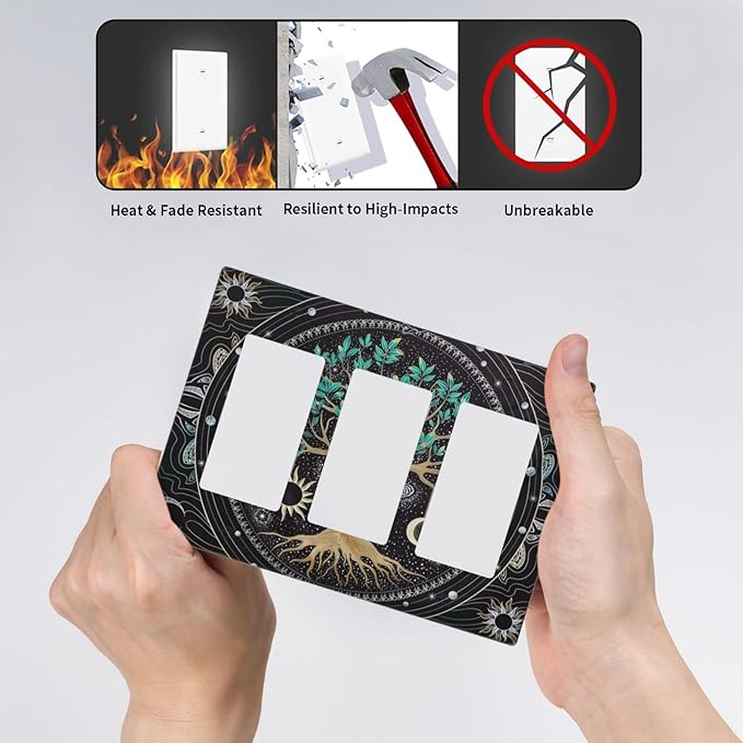 Tree of Life Blackground 3 Gang Rocker Light Switch Plate Hippie Sun Moon Star Triple Decora Outlet Wall Plate Cover Faceplate Decorative Switchcovers GFCI for Bathroom Bedroom Living Room Decorate