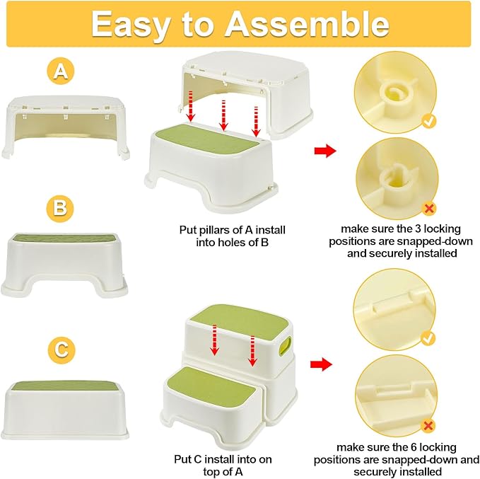 - Easy to Assembly and Cleaning: The kids' step stool is assembled from three independent small stools and can be easily put together within minutes. Please read the included instructions for a more secure installation. Cleaning and maintenance are a breeze, requiring only a simple wipe with a damp cloth or a quick rinse.