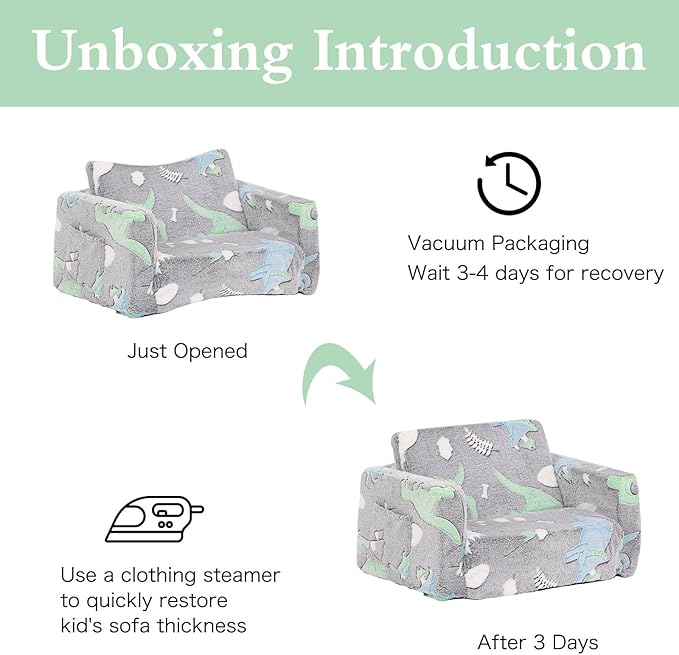 - Tips: When you receive the children's sofa, it may have wrinkles due to being compressed for shipping, but you can either wait 3-4 days for it to regain its original shape naturally or use a clothing steamer to quickly restore its thickness and remove creases.