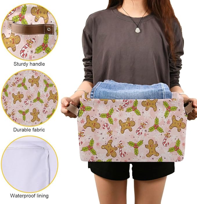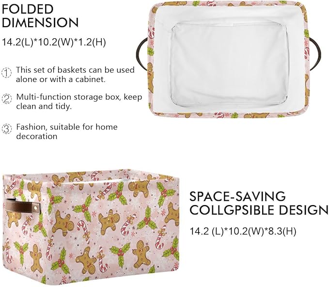 Christmas Gingerbread Man Pink Storage Basket Fabric Kitchen Baskets Candy Cane Poinsettia Winter Open Home Storage Bins Boxes Foldable Organizer Bag for Xmas Decorations Baskets 16×12×8 Inches