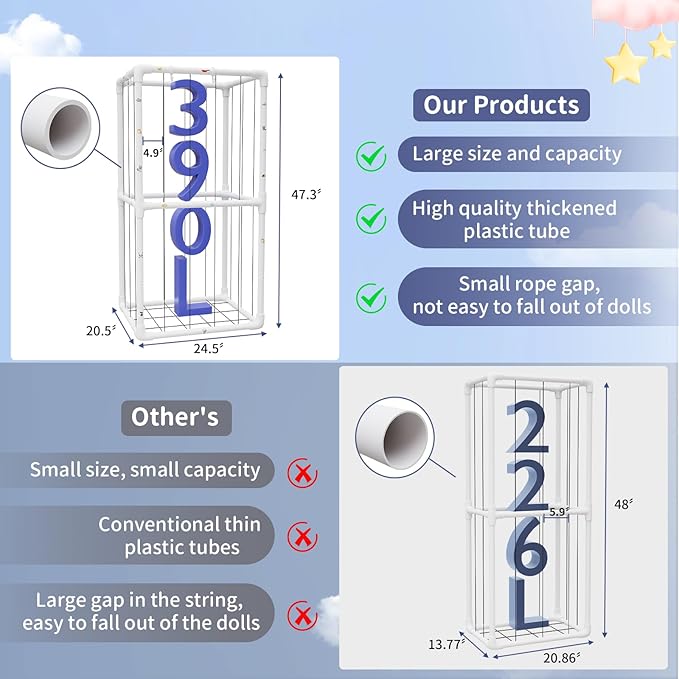 - EXTRA LARGE TOY STORAGE: Our plush stuffed animal zoo storage holder provides ample storage for toys, even the largest plush stuffed animal. With dimensions of 24.5 x 20.5 x 47 inches and the ability to hold more than 30 plush toys. No more worrying about your stuff animal overflowing stuffed animal net or hammock. No more tripping over toys and stepping on plushies.