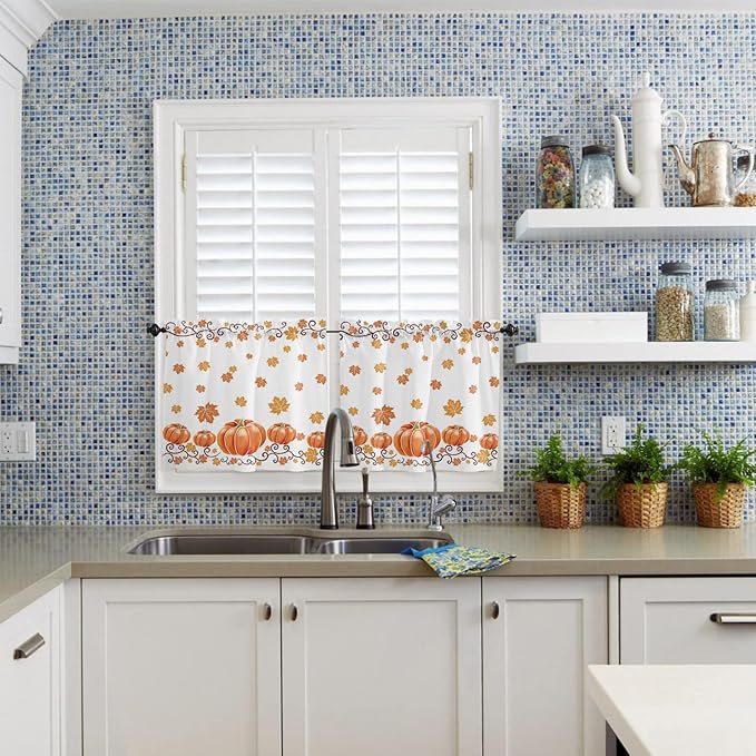 Fall Maple Leaves Kitchen Curtains and Valances Set, Thanksgiving Watercolor Pumpkins Half/Short Curtains for Small Windows Cafe /Living Room/ Bedroom 54x 36 in-,Orange Window Treatments Tiers