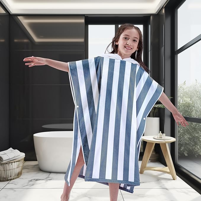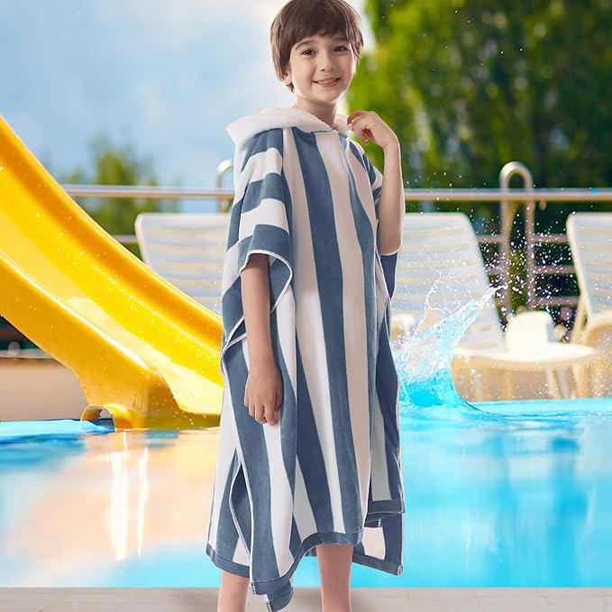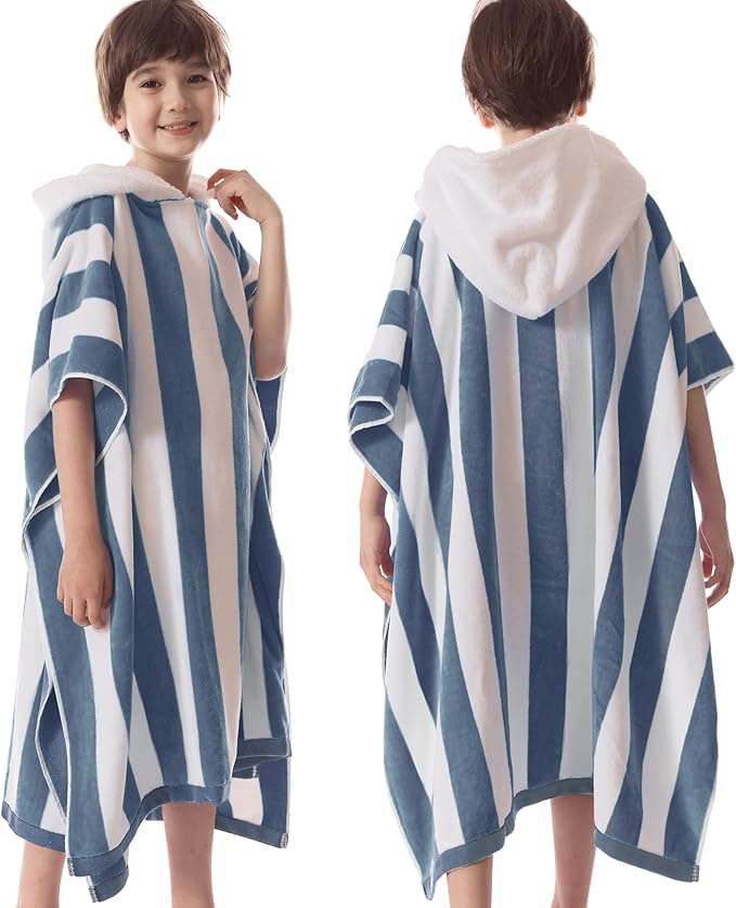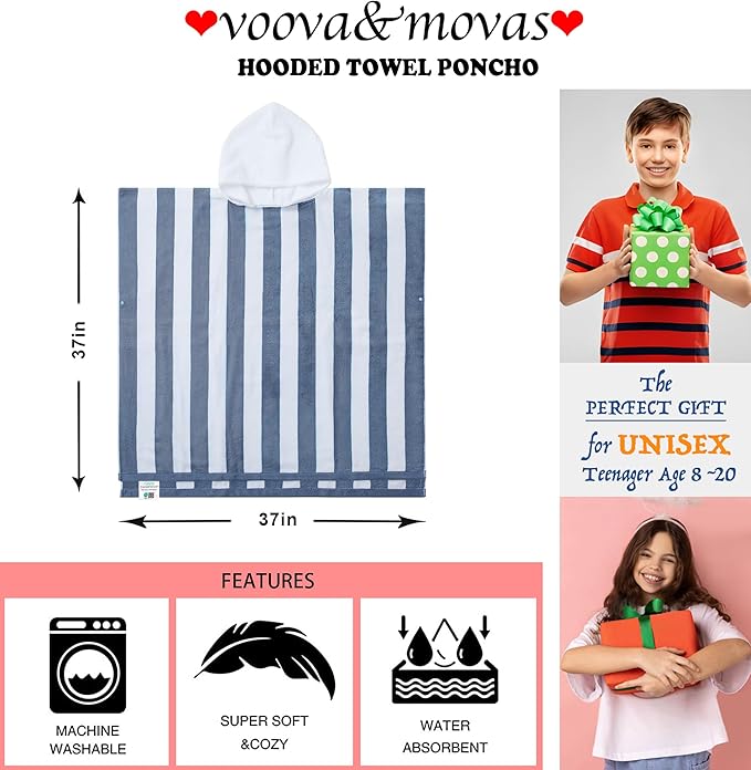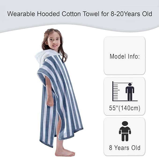 VOOVA & MOVAS Hooded Beach Towel Poncho for Teens (8-16Years), 100% Cotton Thick Surf Poncho Towel Robe for Kids, Perfect for Pool, Beach, Bath Activities and Gifts,Blue Grey Cabana Stripe