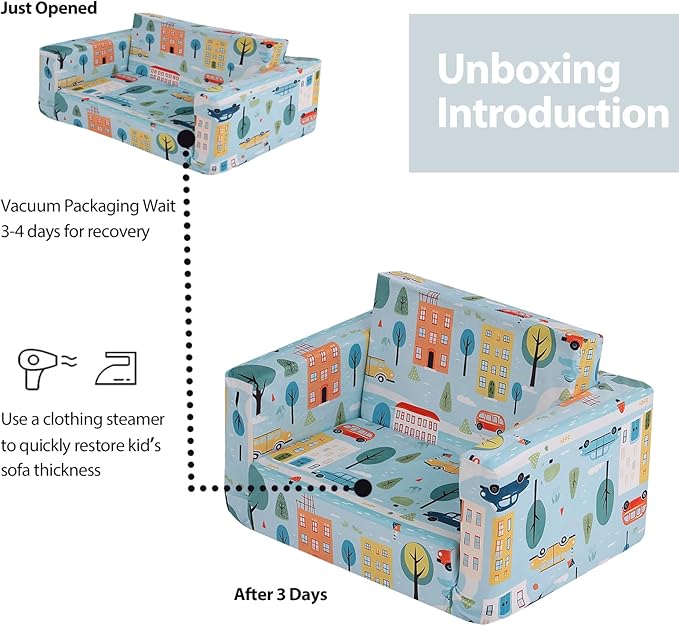 - 【Foldable Kids Sofa】: Children's sofa offer the flexibility to adapt to different situations. With a simple fold, they can effortlessly convert between a traditional sofa and a lounger, accommodating various seating preferences or transforming playtime into relaxation time.