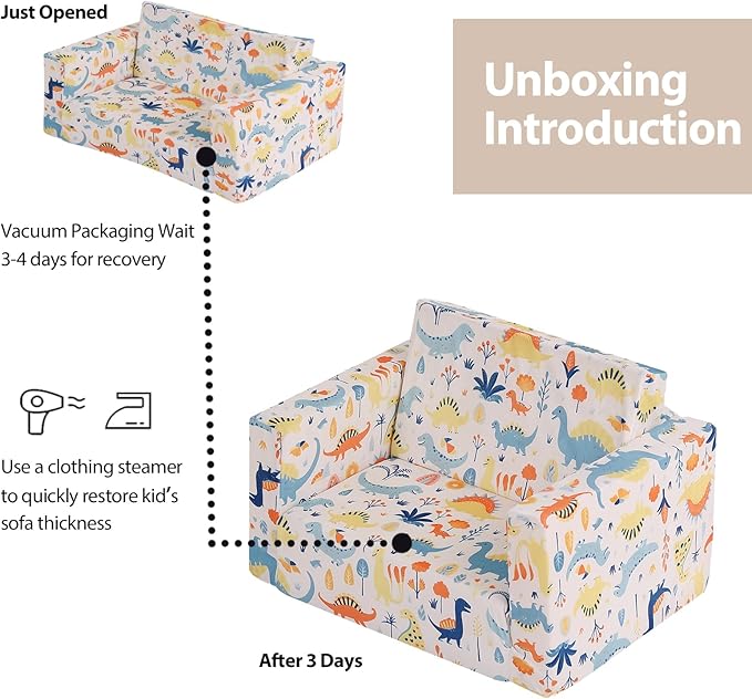 - 【Foldable Kids Sofa】: Children's sofa offer the flexibility to adapt to different situations. With a simple fold, they can effortlessly convert between a traditional sofa and a lounger, accommodating various seating preferences or transforming playtime into relaxation time.