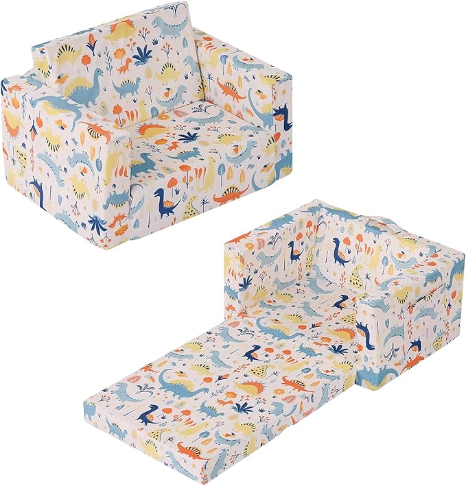 Tiita Toddler Chairs Sofa, 2-in-1 Kids Sofa Couch, Convertible Children Couch to Lounger, Flip Out Kids Sofa Chair, Toddler Armrest Chair Bed for Girl or Boy, White Dinosaur