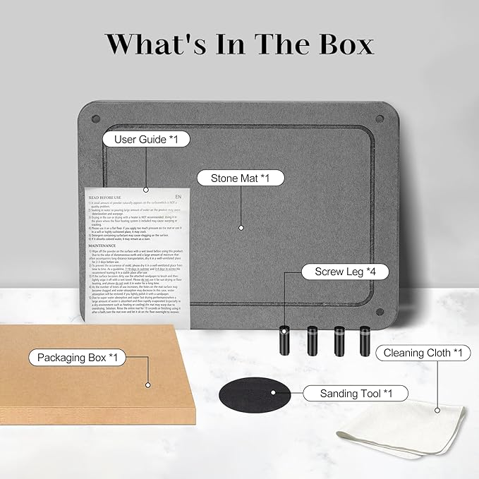 - 【What You Get】The packaging box includes 1 stone mat, 1 sanding tool, 1 cleaning cloth, 4 screw legs and 1 instruction. Our stone mat is a necessary and perfect product for your home, if you have any problem about the product, please feel free to contact us.