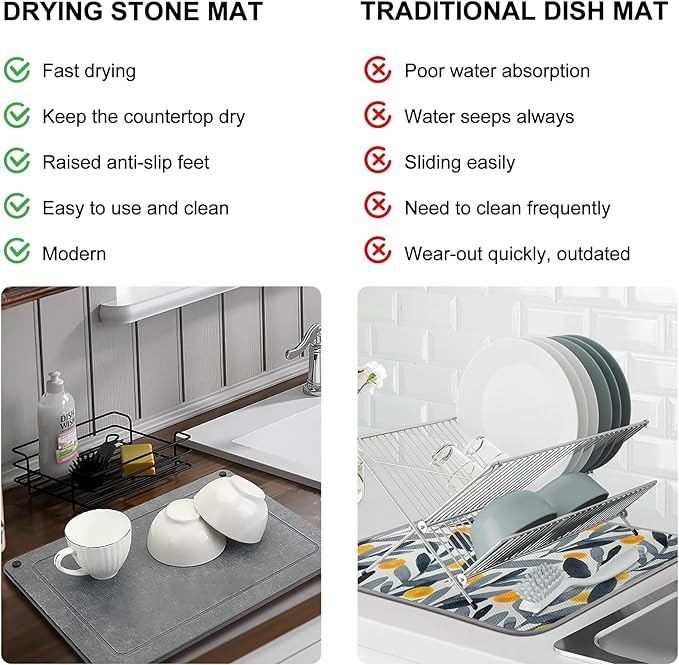 - 【Fast-Drying & Durable】Unlike traditional cloth drying mat, our stone dish drying mat is made of diatomaceous earth, which is designed to absorb water quickly and durable, the countless air holes inside the stone mat can instantly absorb drips, keep your countertop dry, clean and organized. You don’t need to worry about it will wear out quickly like cloth drying mat. No more water all over the counter, wet towels and wasted paper towels.