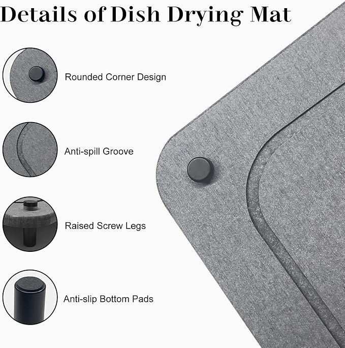 - 【Raised Anti-slip Feet & Anti-spill Groove Design】Each diatomaceous earth drying mat is equipped with 4 screw legs, the bottom of the feet come with anti-slip pads, which make the dish drying mat elevate from the table to protect your counter from scratches, avoid sliding easily during use, no water pooling under the surface. The mat has a concave groove around the edges, keeping the water from spilling over the edge and flowing down to the counter.