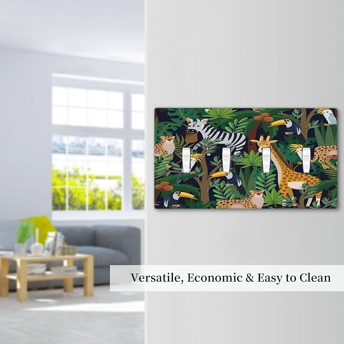 Cartoon Animal Zebra Leopard Giraffe Bird Leaf Quad Toggle Nursery Light Switch Covers Decorative 4 Gang Wall Plate Electrical Faceplate Switchplate for Kidroom Bedroom Bathroom Decor